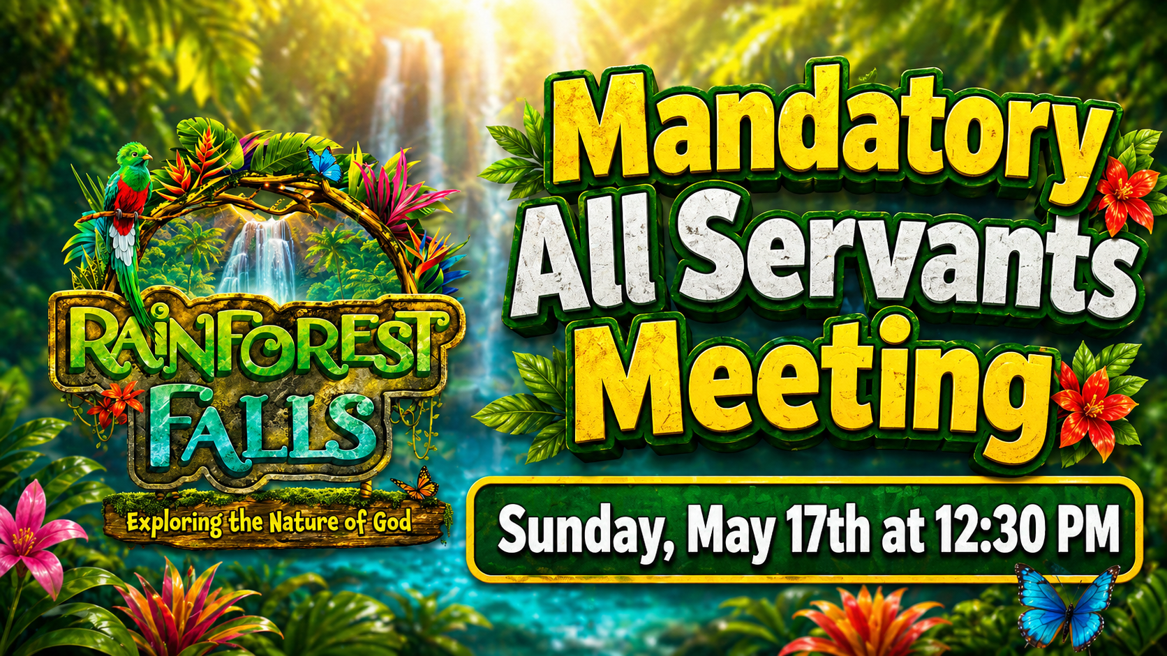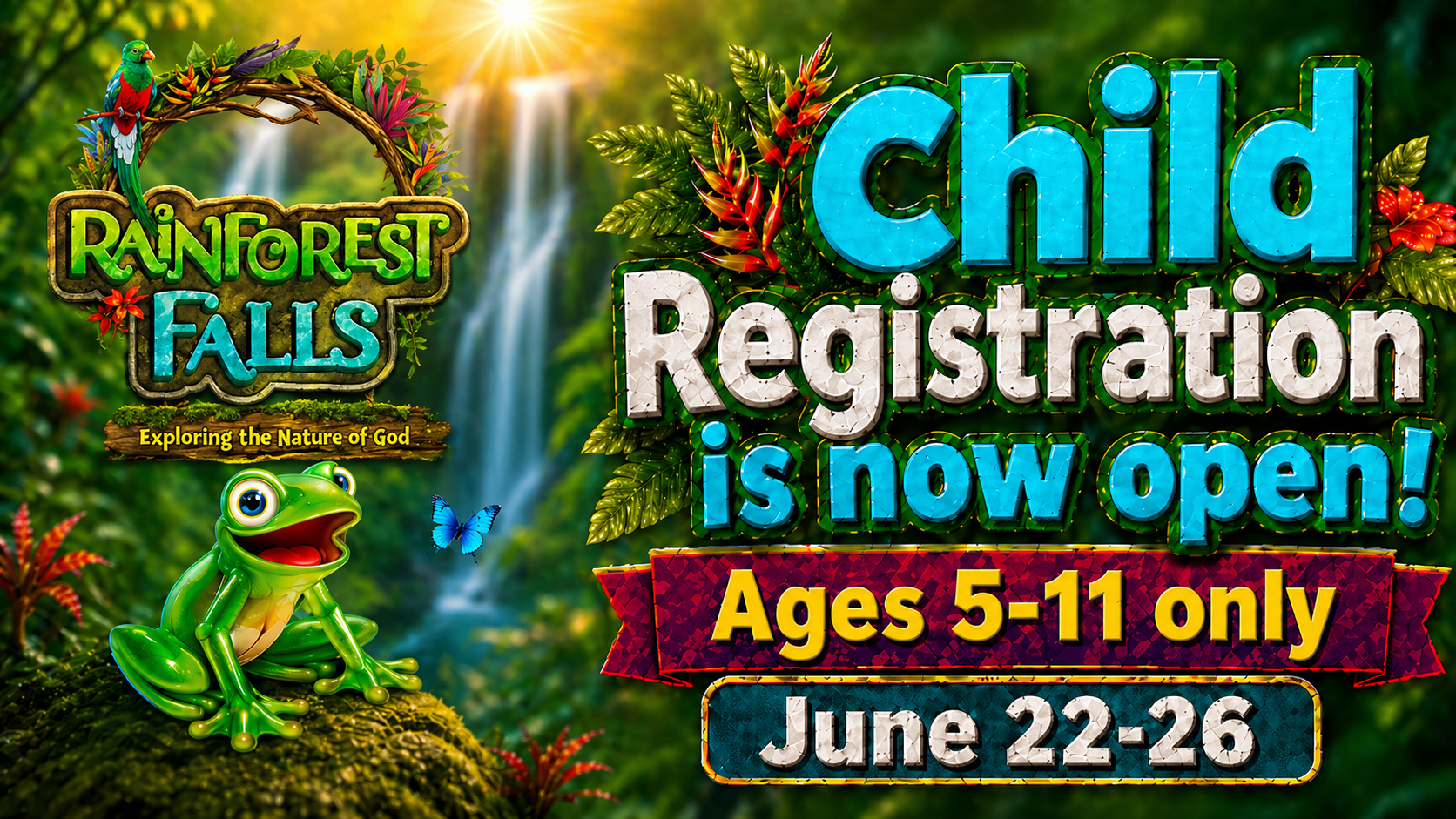 Get ready for an adventure like no other! June 22-26! Child Registration is now open! At Rainforest Falls VBS, kids will embark on a lush, vibrant journey deep into the heart of an awe-inspiring rainforest—where every day is packed with adventure! They’ll explore the wonders of God’s creation surrounded by vibrant, exotic scenery and uncover the richness of God’s love. Ages: 5-11 ! Be sure to register before June 7, which is the cutoff to guarantee a shirt size!